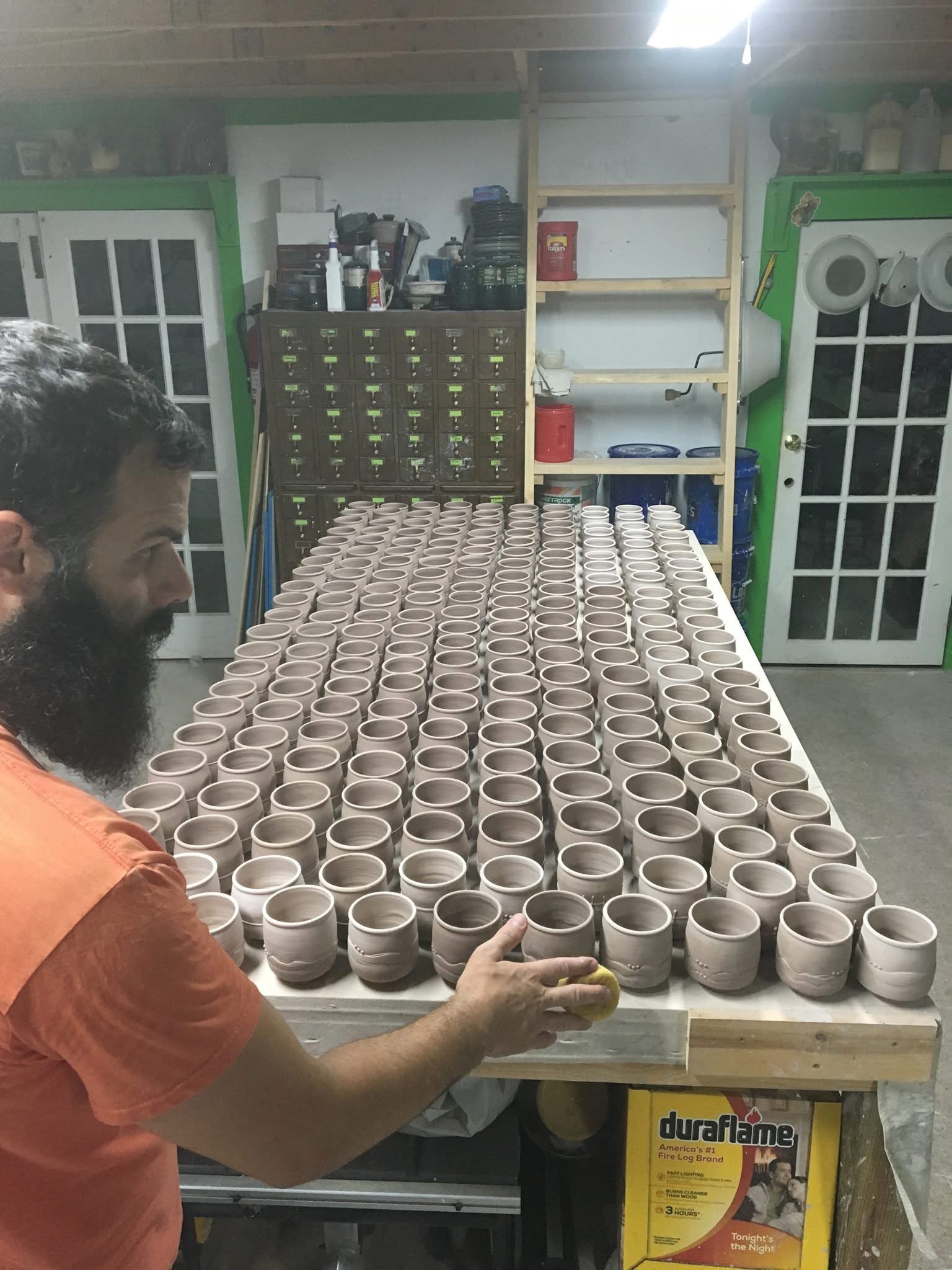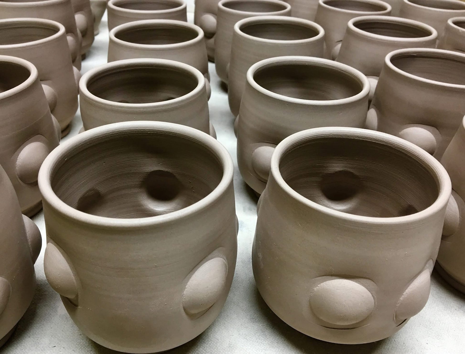 Bumps made by using an old wooden tablespoon held against the outside of a vessel as index finger is pressed from the inside outward. This creates a consistent round bump to the exterior of the vessel. Glazes behave interesting as they find the path of least resistance around these bumps. These bumps give the user a functional gripping point.