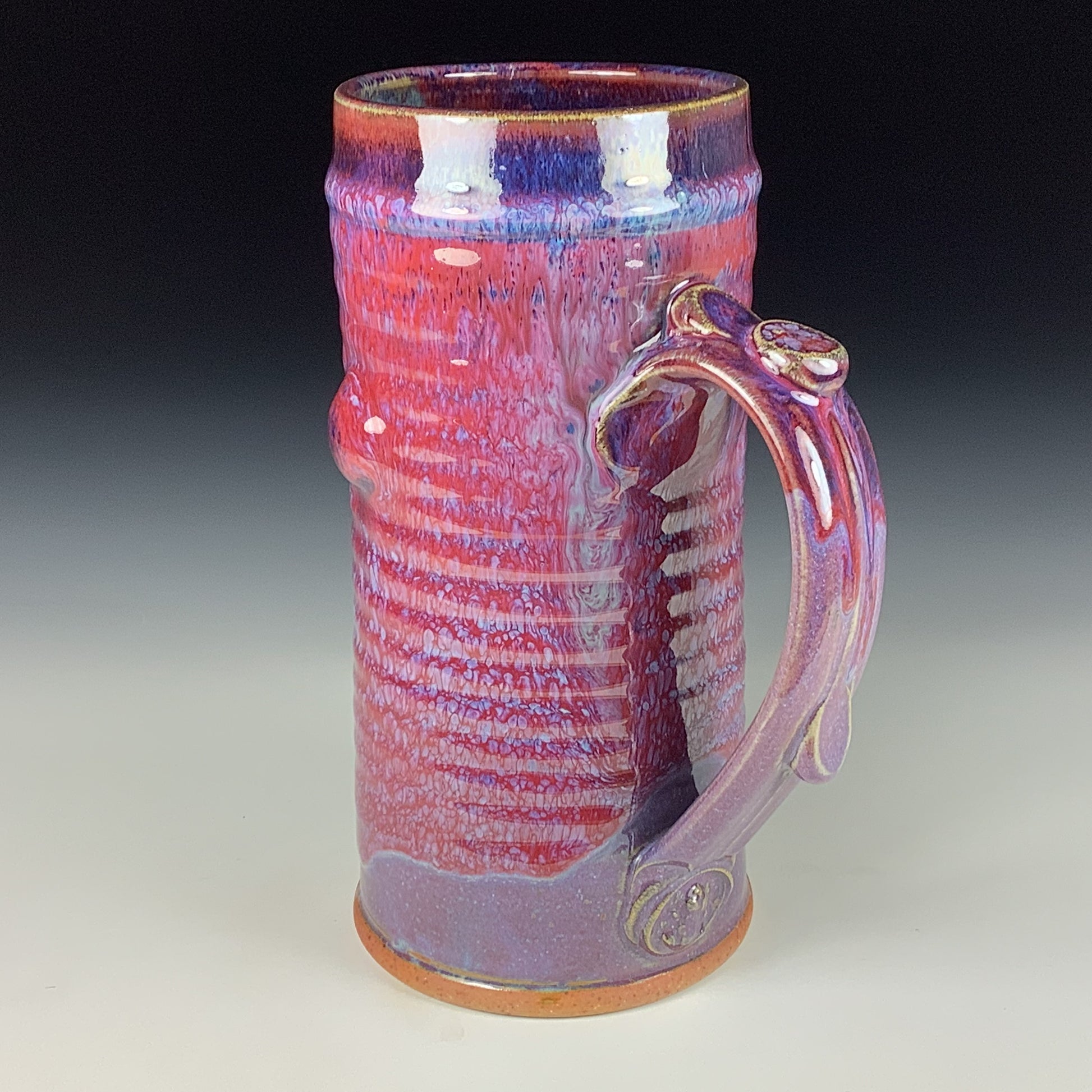 High-fired Cone10-11 ceramic stoneware pottery large mug. High-fired to 2350 degrees in a homemade kiln in a gas reduction-type atmosphere. Glossy, handmade layers of flowing glazes. Clean finish. High-end individually made pieces masterfully thrown on a pottery wheel. Artist signature is represented as a traditional potter's "chop" (hand-carved stamped frog).