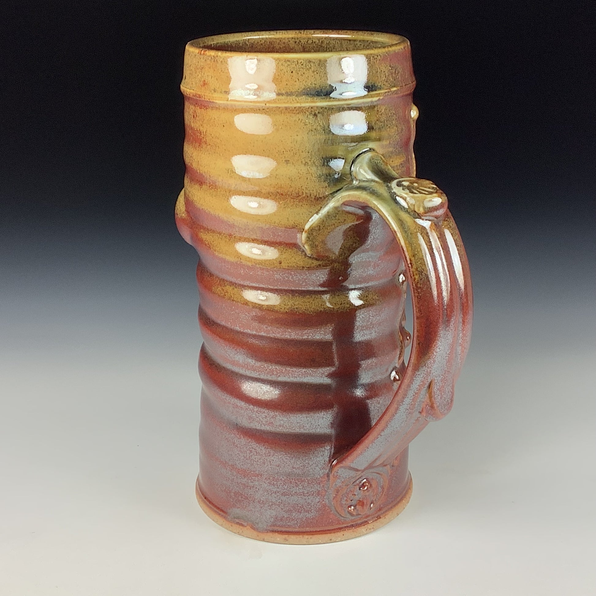 High-fired Cone10-11 ceramic stoneware pottery large mug. High-fired to 2350 degrees in a homemade kiln in a gas reduction-type atmosphere. Glossy, handmade layers of flowing glazes. Clean finish. High-end individually made pieces masterfully thrown on a pottery wheel. Artist signature is represented as a traditional potter's "chop" (hand-carved stamped frog).
