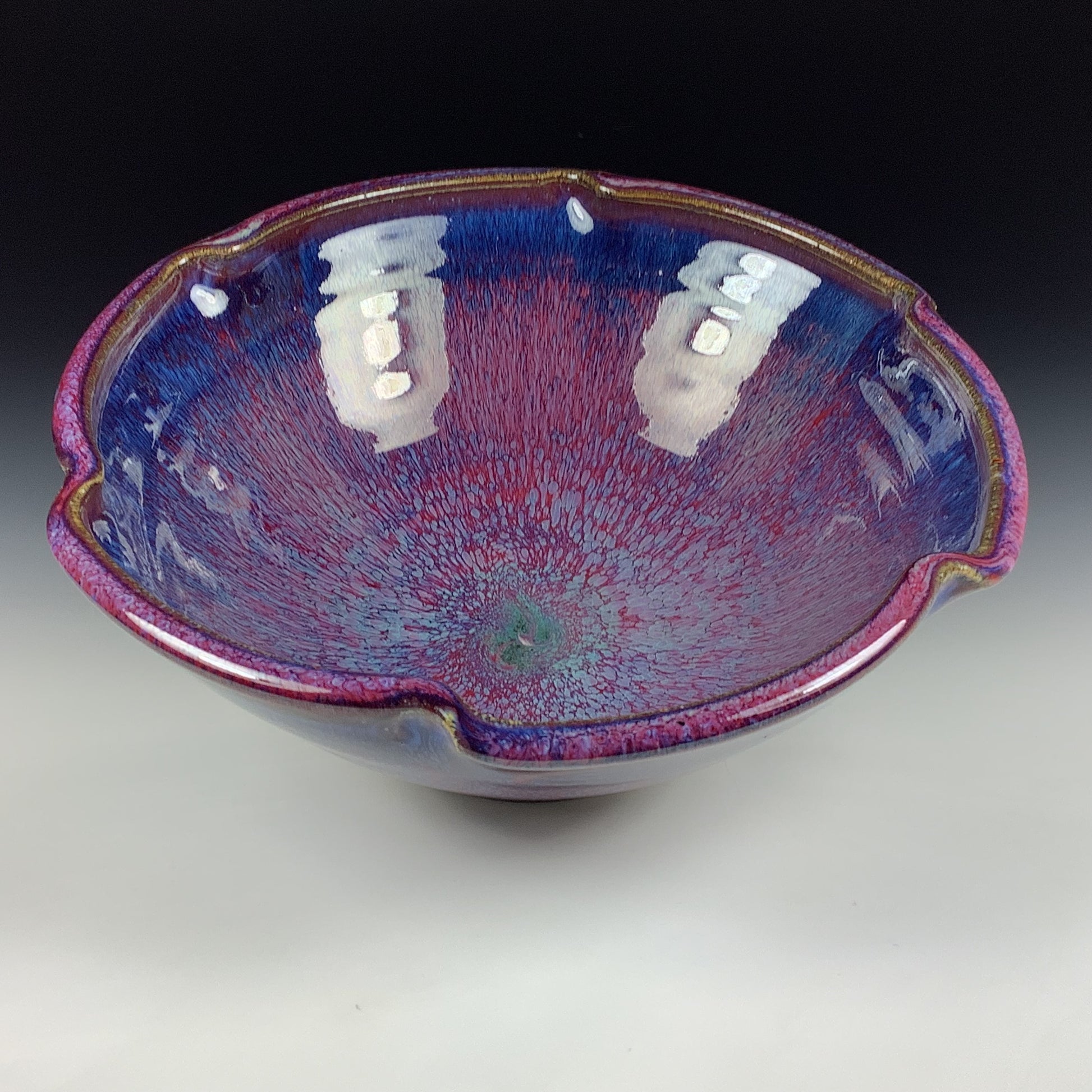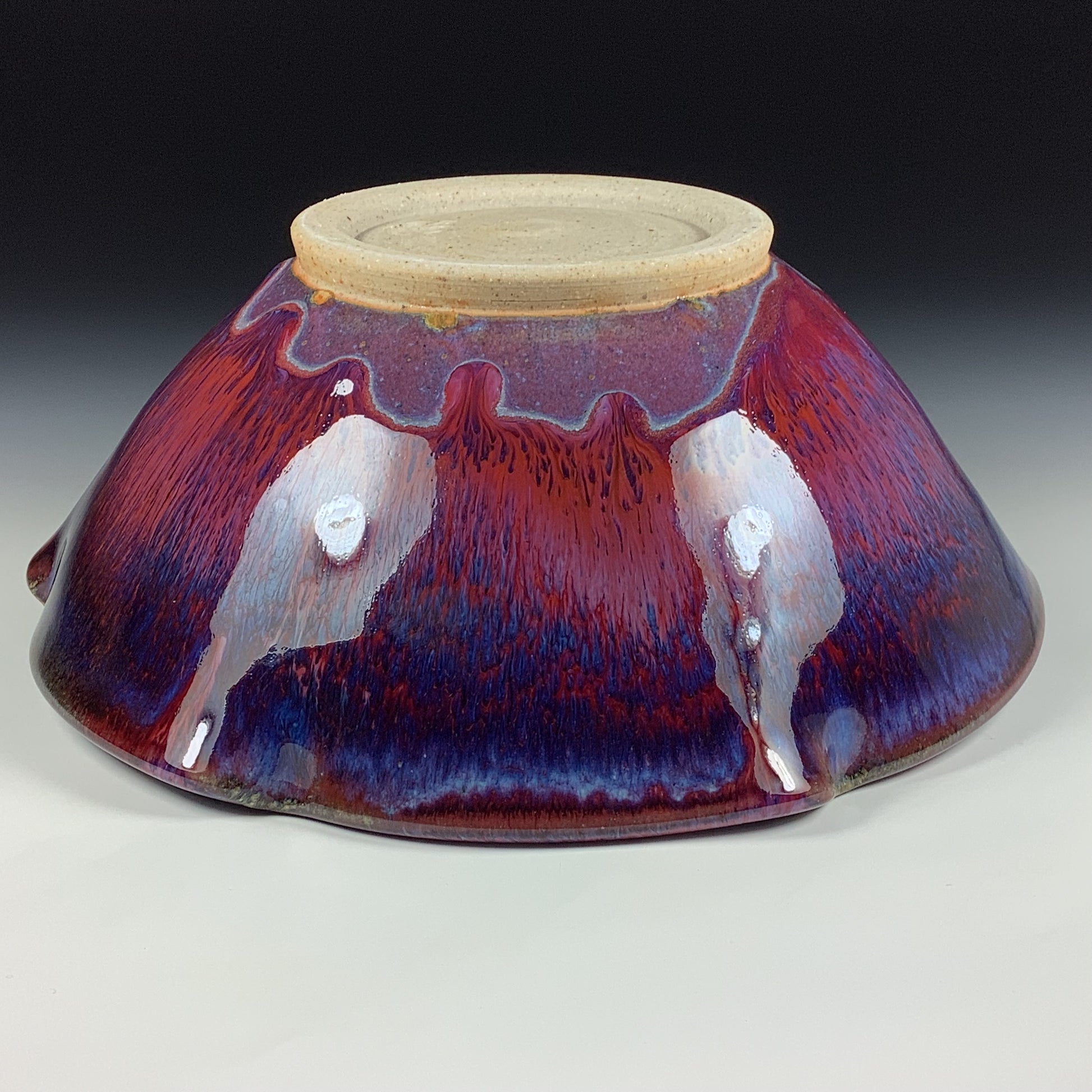 High-fired Cone10-11 ceramic stoneware pottery bowl. High-fired to 2350 degrees in a homemade kiln in a gas reduction-type atmosphere. Glossy, handmade unique layers of flowing glazes. Clean finish. High-end, individually made, unique pieces masterfully hand thrown on a pottery wheel. Artist signature is represented as a traditional potter's "chop" (hand-carved clay stamped frog).