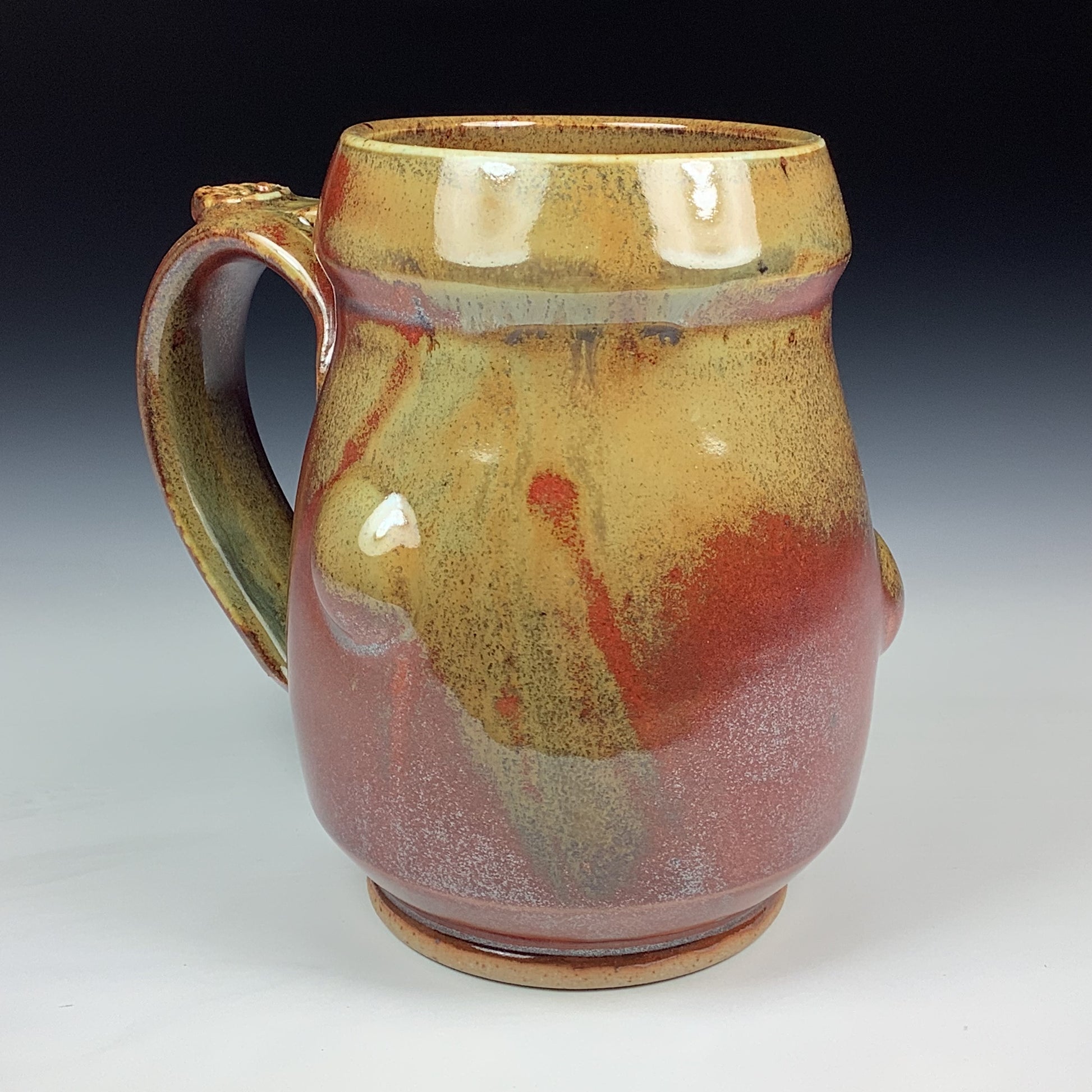 High-fired Cone10-11 ceramic stoneware pottery mug. High-fired to 2350 degrees in a homemade kiln in a gas reduction-type atmosphere. Glossy, handmade unique layers of flowing glazes. Clean finish. High-end, individually made, unique pieces masterfully hand thrown on a pottery wheel. Artist signature is represented as a traditional potter's "chop" (hand-carved clay stamped frog).