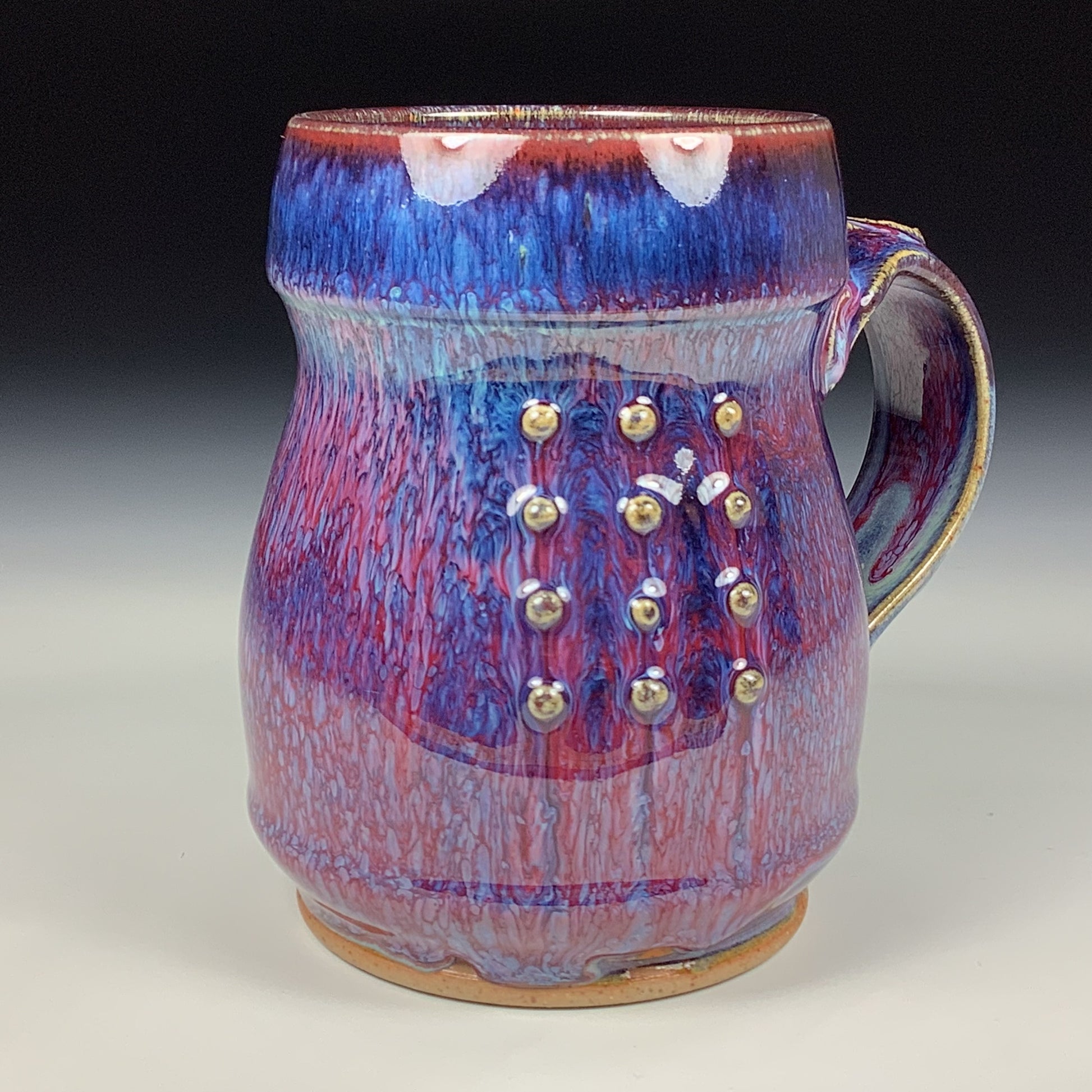 Dots are made by using a liquified clay called “slip” that is deliberately squeezed on to an object one little dot at a time to create a raised surface. This gives the form texture and interferes with the fluidity of the layers of homemade glazes.