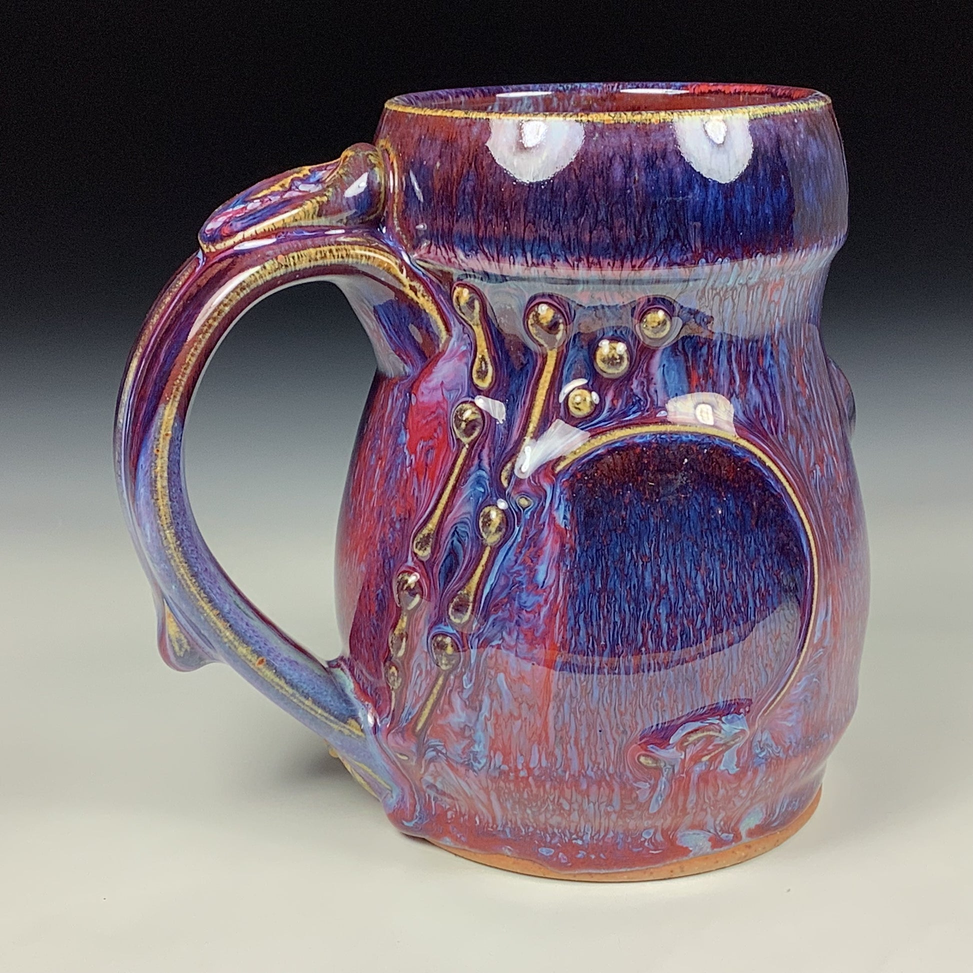 High-fired Cone10-11 ceramic stoneware pottery mug. High-fired to 2350 degrees in a homemade kiln in a gas reduction-type atmosphere. Glossy, handmade unique layers of flowing glazes. Clean finish. High-end, individually made, unique pieces masterfully hand thrown on a pottery wheel. Artist signature is represented as a traditional potter's "chop" (hand-carved clay stamped frog).