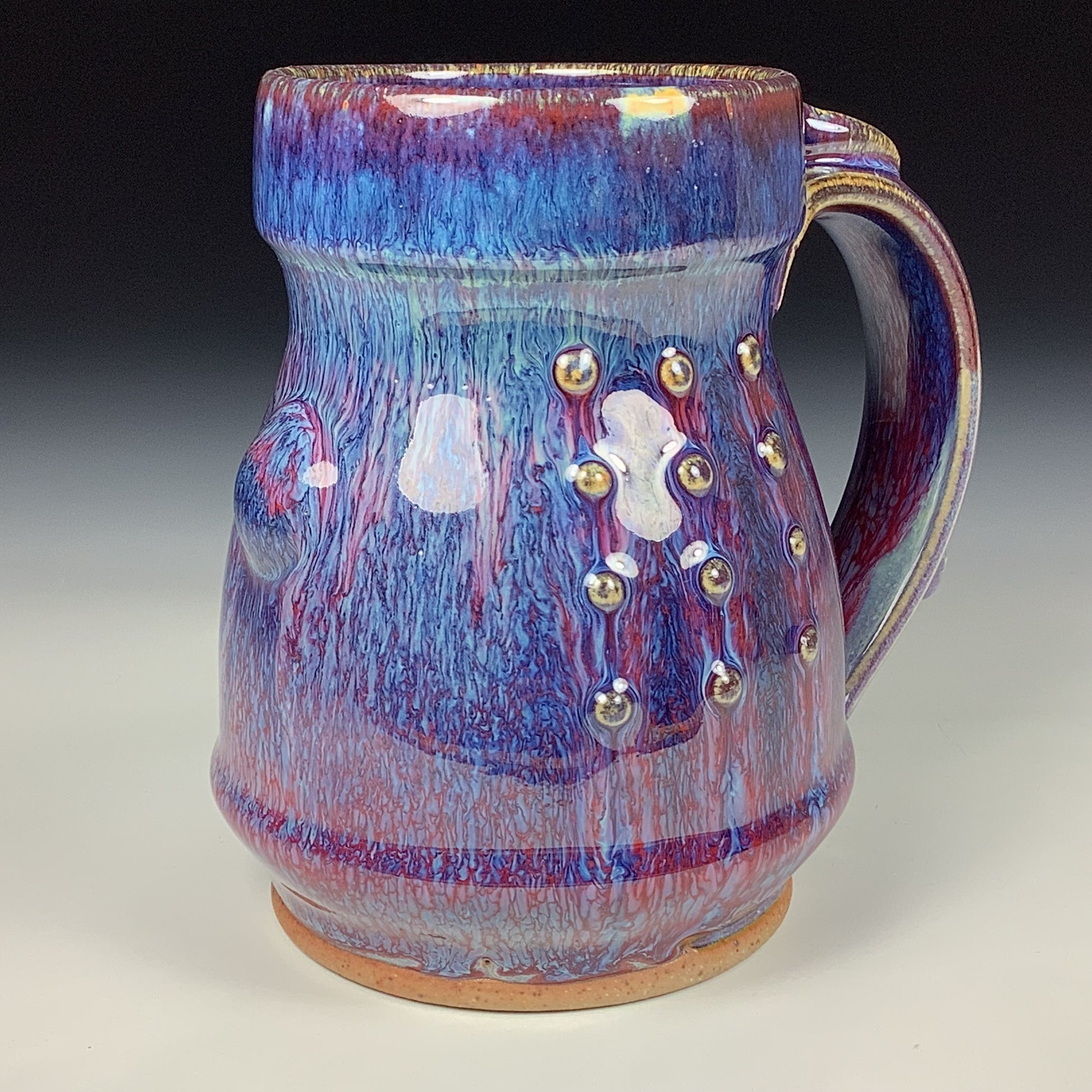 High-fired Cone10-11 ceramic stoneware pottery mug. High-fired to 2350 degrees in a homemade kiln in a gas reduction-type atmosphere. Glossy, handmade unique layers of flowing glazes. Clean finish. High-end, individually made, unique pieces masterfully hand thrown on a pottery wheel. Artist signature is represented as a traditional potter's "chop" (hand-carved clay stamped frog).