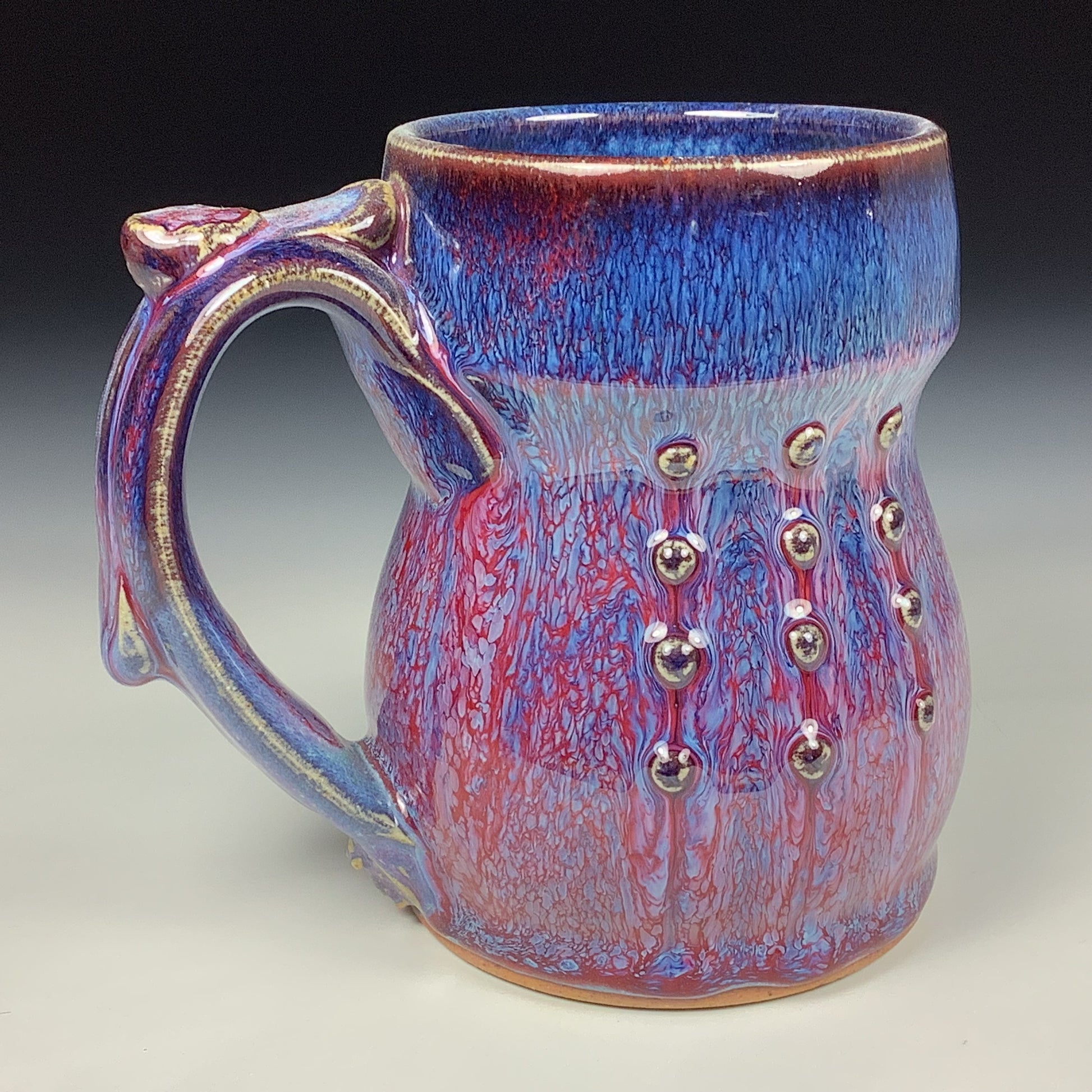 Bumps made by using an old wooden tablespoon held against the outside of a vessel as index finger is pressed from the inside outward. This creates a consistent round bump to the exterior of the vessel. Glazes behave interesting as they find the path of least resistance around these bumps. These bumps give the user a functional gripping point.