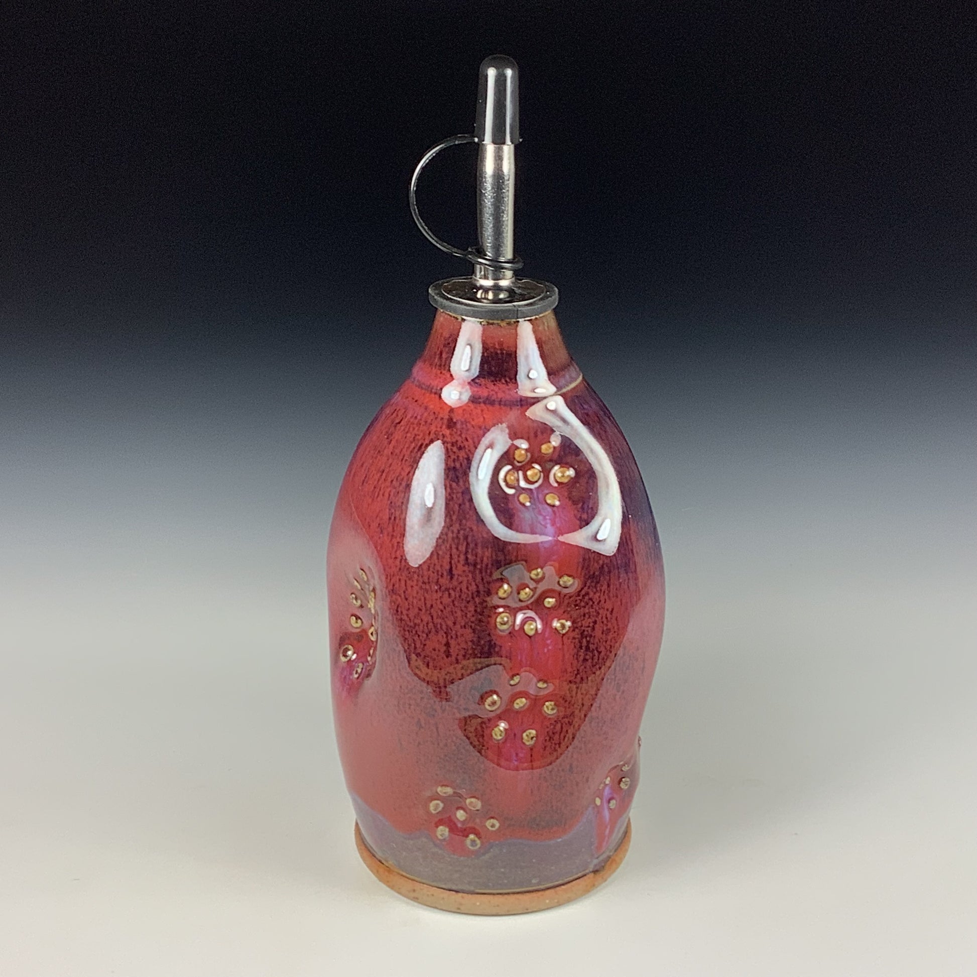 High-fired Cone10-11 ceramic stoneware pottery oil cruet/bottle. High-fired to 2350 degrees in a homemade kiln in a gas reduction-type atmosphere. Glossy, handmade layers of flowing glazes. Clean finish. High-end individually made pieces masterfully thrown on a pottery wheel. Comes with fitted metal pouring spout. Artist signature is represented as a traditional potter's "chop" (hand-carved stamped frog).