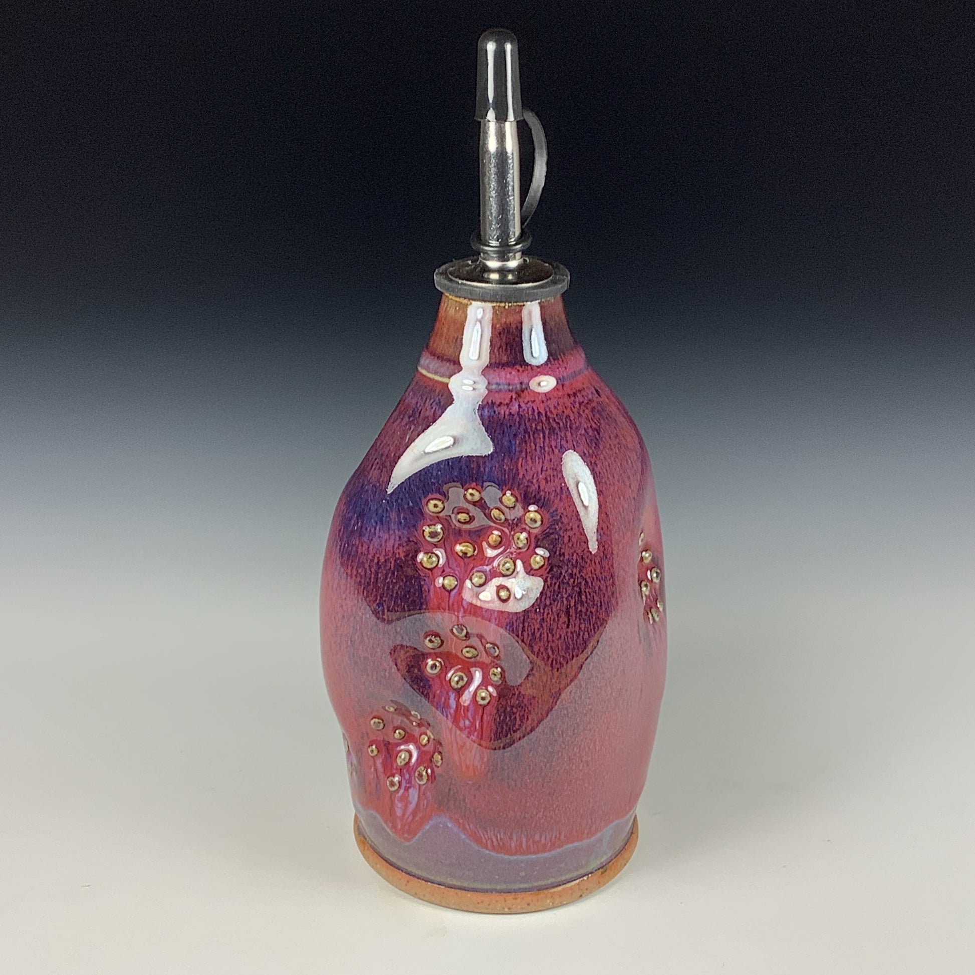 Ceramic olive oil dispenser oil bottle oil cruet handmade stoneware pottery dinnerware kitchenware - Purple red slip dotted indented - item 3751